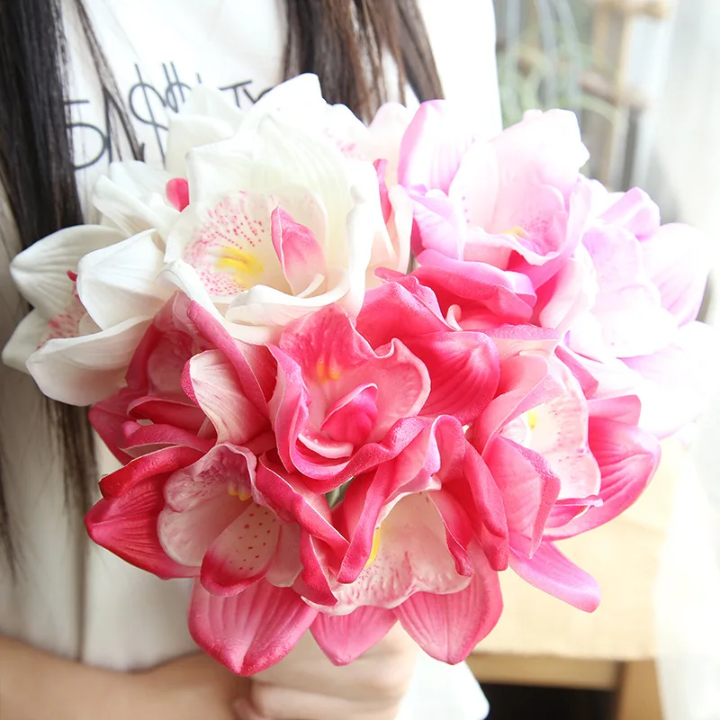 Best 6 Heads Real Touch Artificial Orchids PU Cymbidium Magnolias Bouquet Fake Flowers DIY Wedding Bride